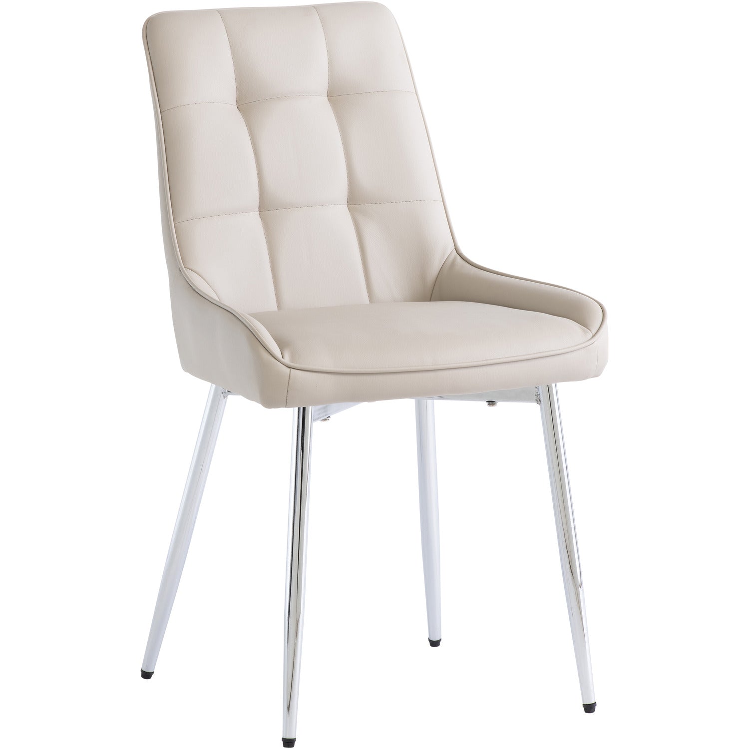 Upholstered in faux leather, this dining chair has a well-padded back and seat cushion to offer maximum comfort. It is finished with a set of polished chrome legs that add to its contemporary look and allows it to look great in any kitchen or dining space.