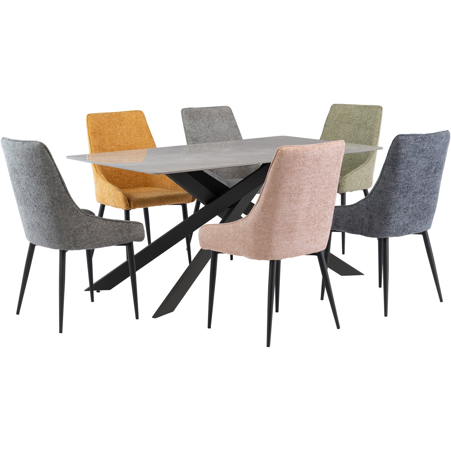 Modern designer chic is delivered in this statement dining chair with beautifully tailored textured fabric with piping detail and black powder-coated legs.