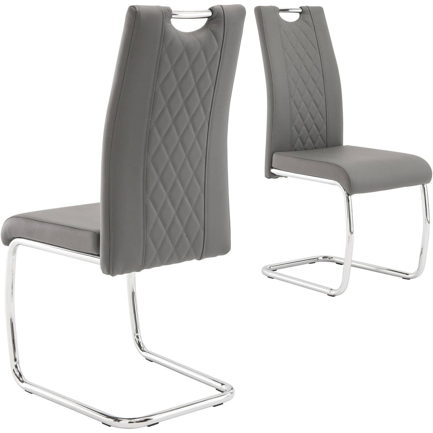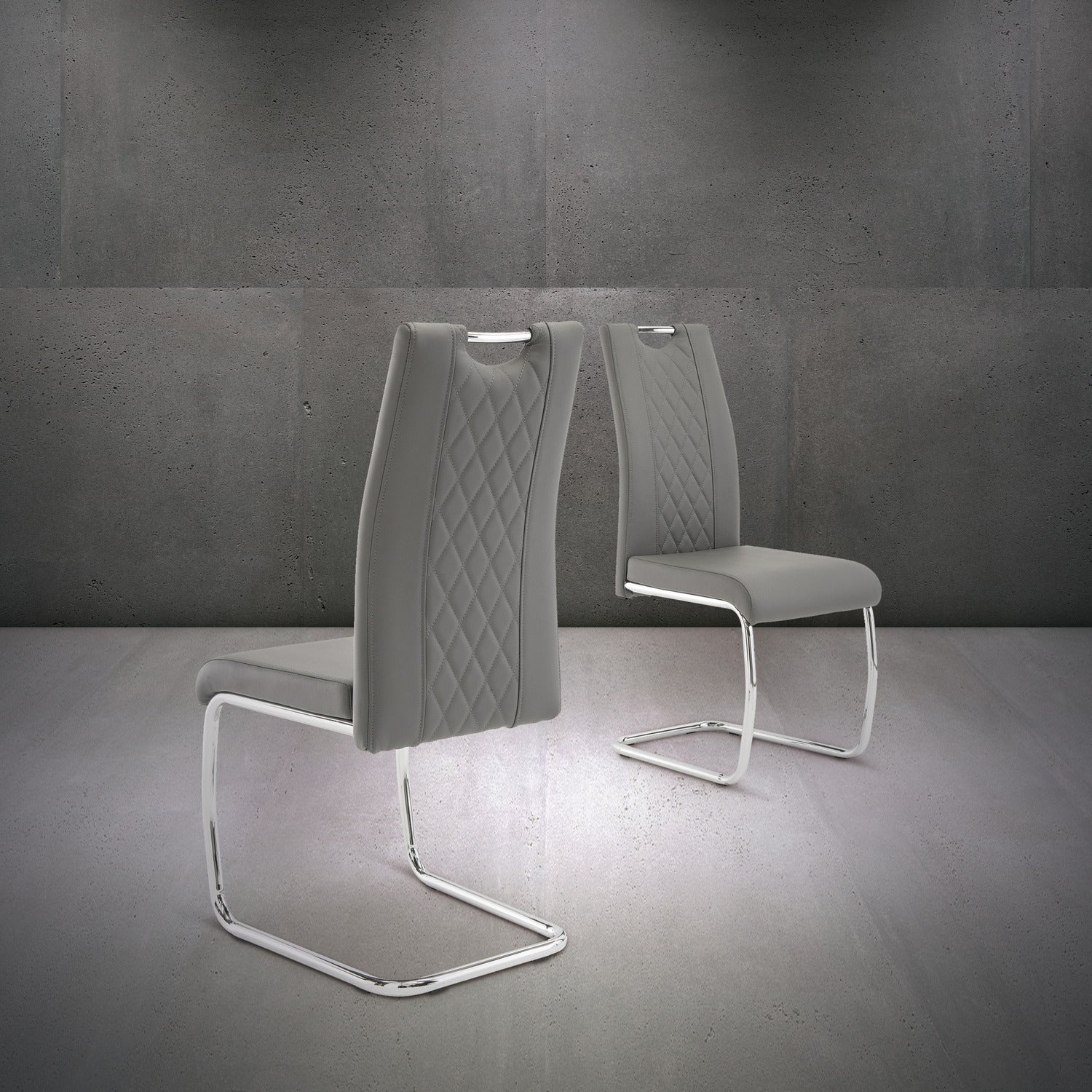 Beautifully tailored dining chair in grey PU with cross stitch pattern inlay and chrome handle for easy moving.